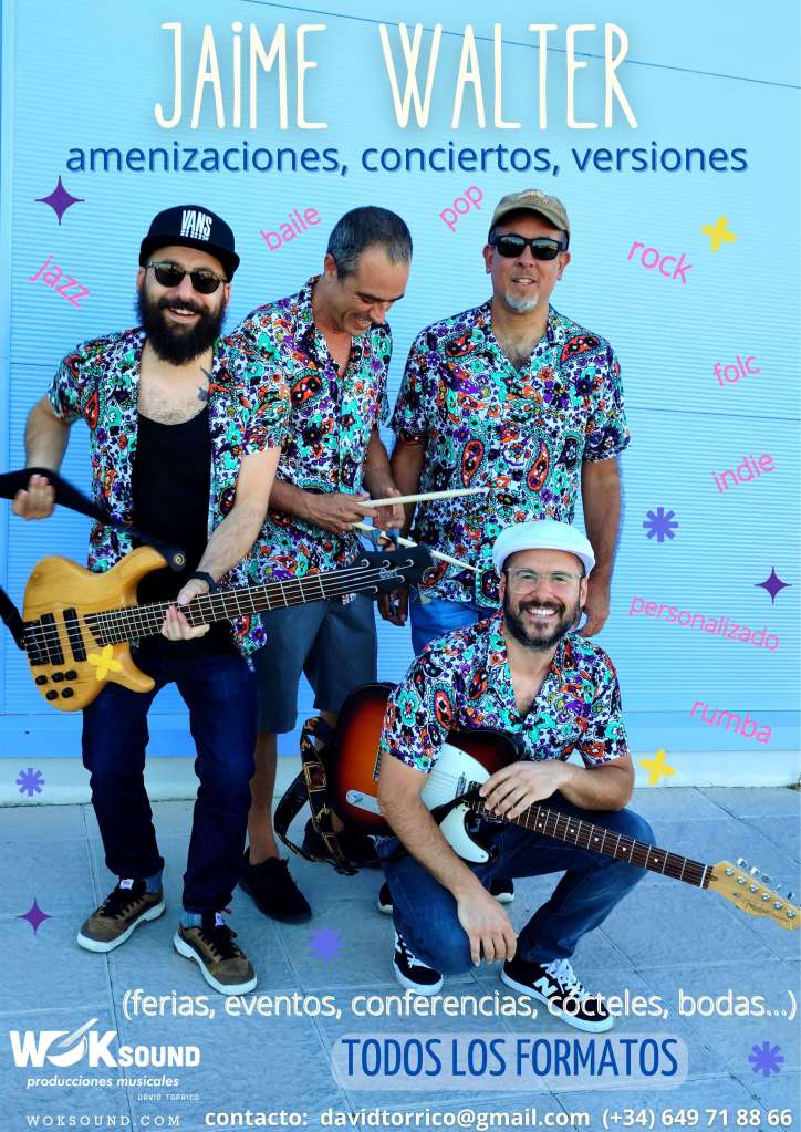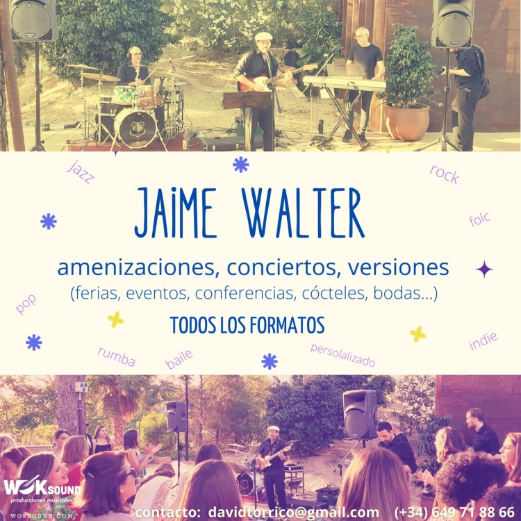 Bajo el nombre de «Jaime Walter», ofrecemos amenizaciones y conciertos para todo tipo de eventos (ferias, conferencias, cócteles, bodas…) y con casi cualquier formato de instrumentos (personal, dúo, banda…). Desde el Pop hasta la rumba, pasando por música más bailable, rock o sonidos Jazz para acompañar.